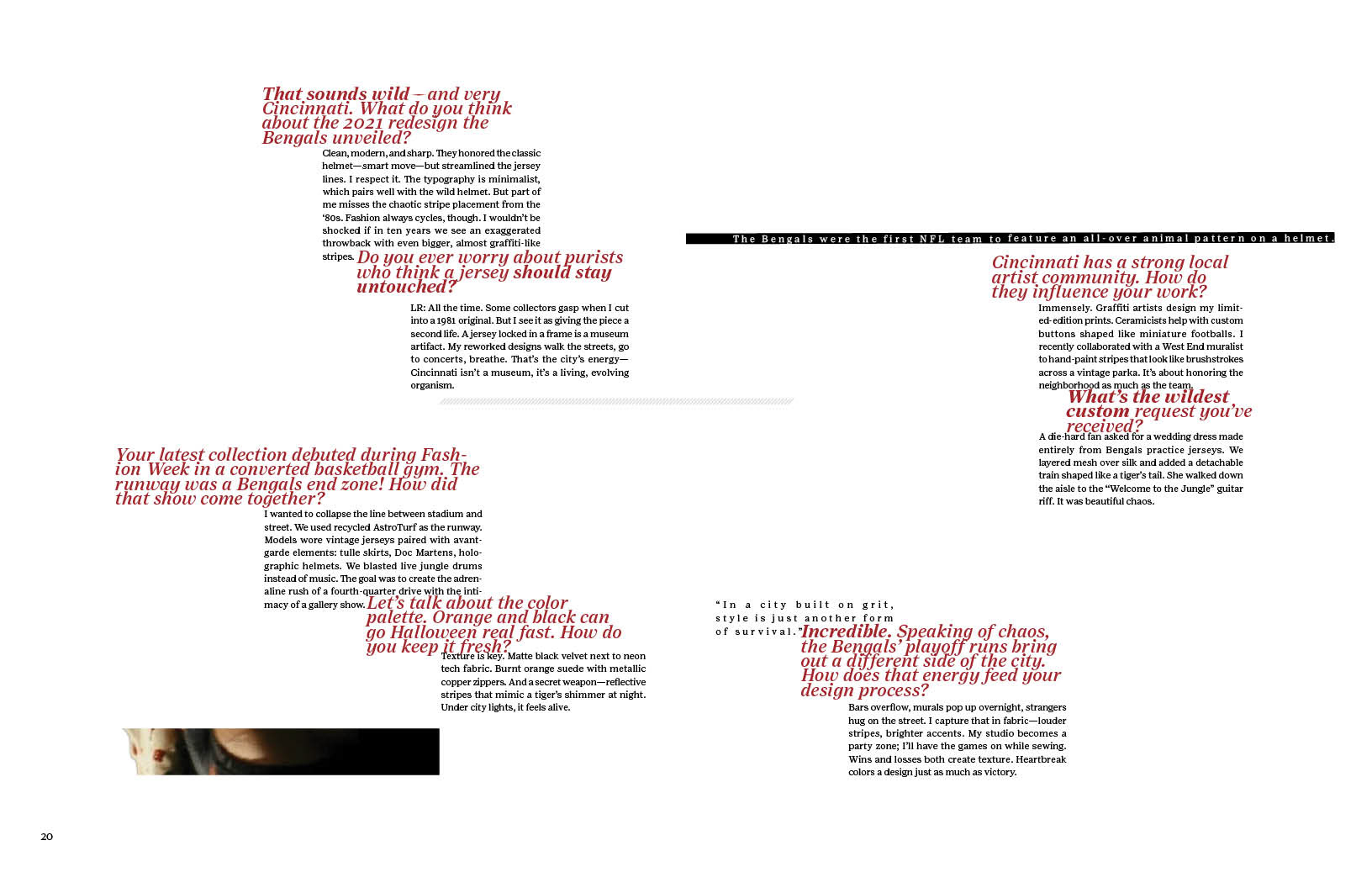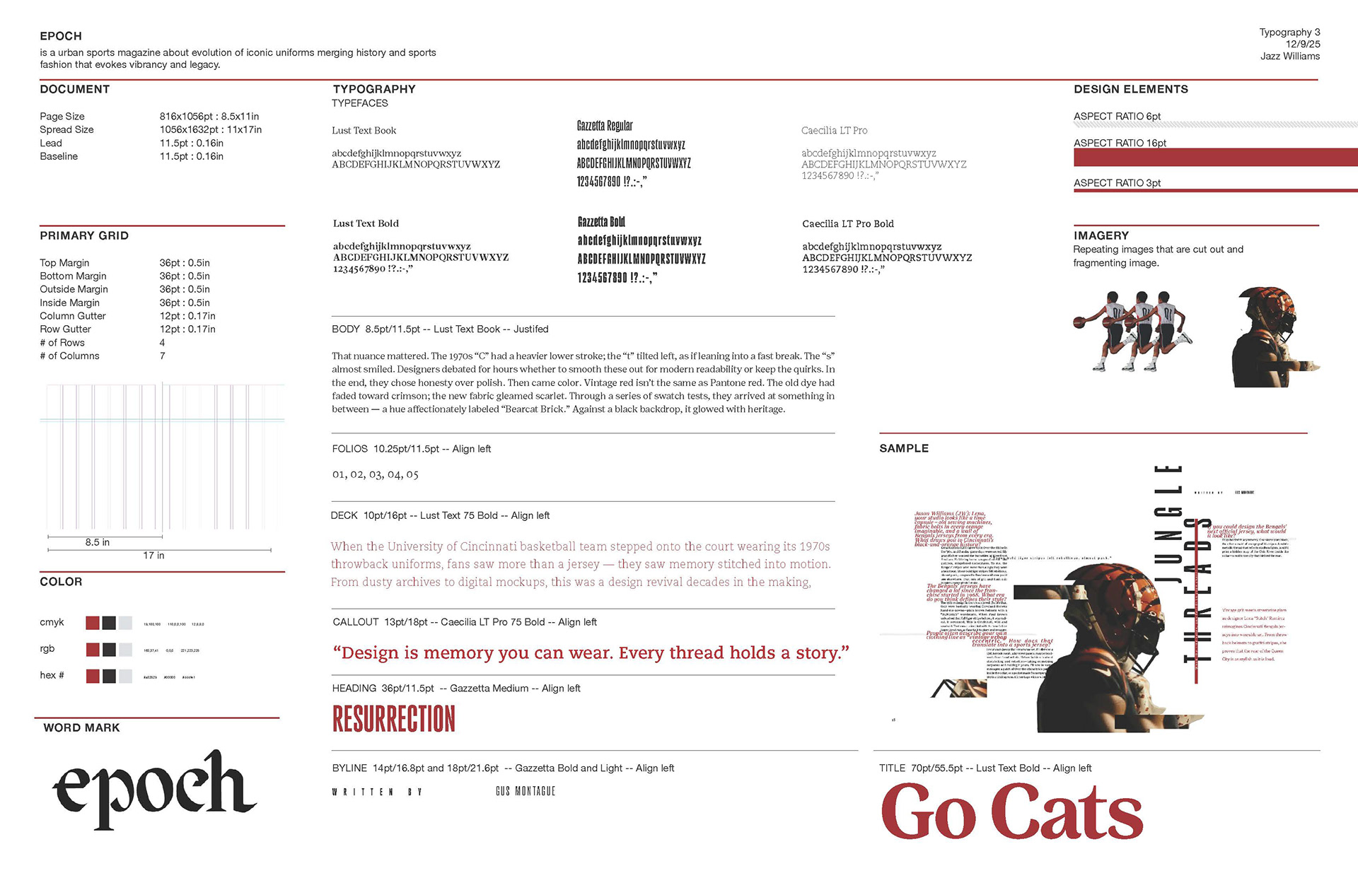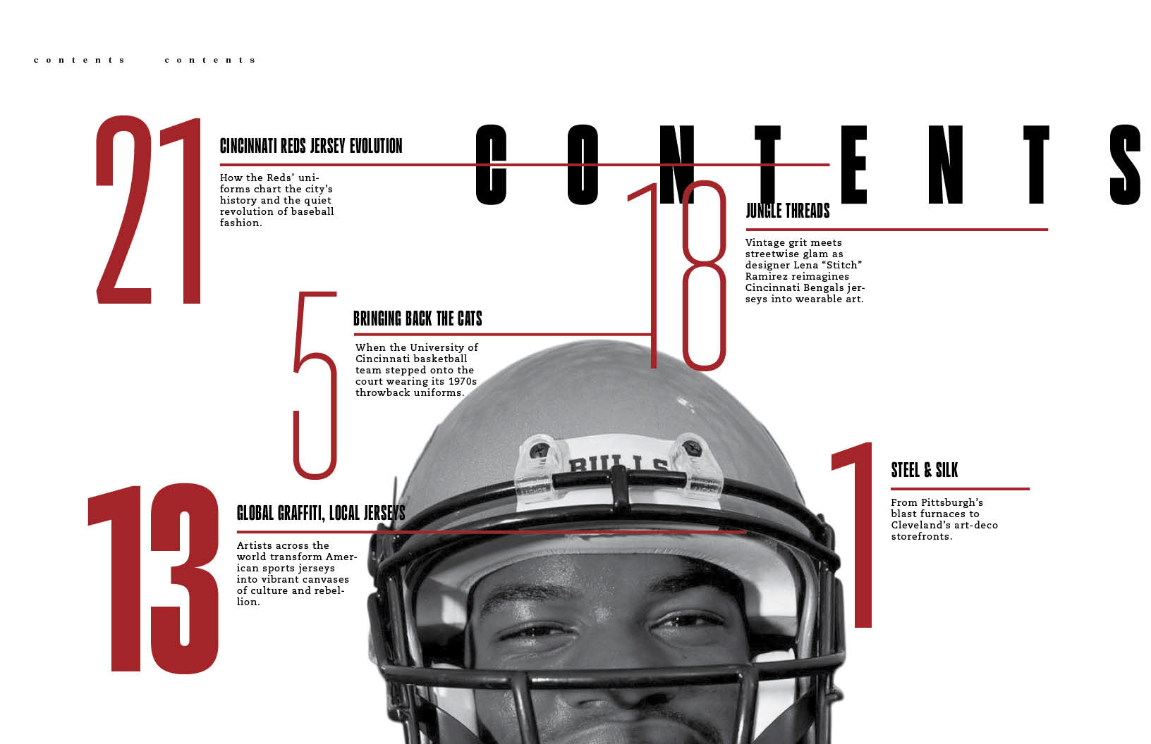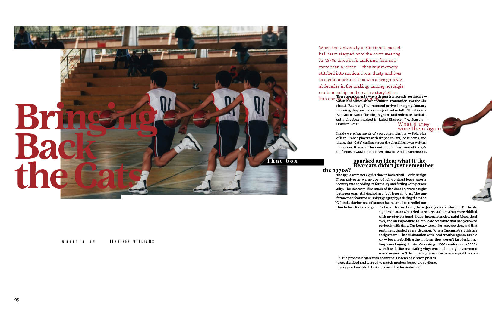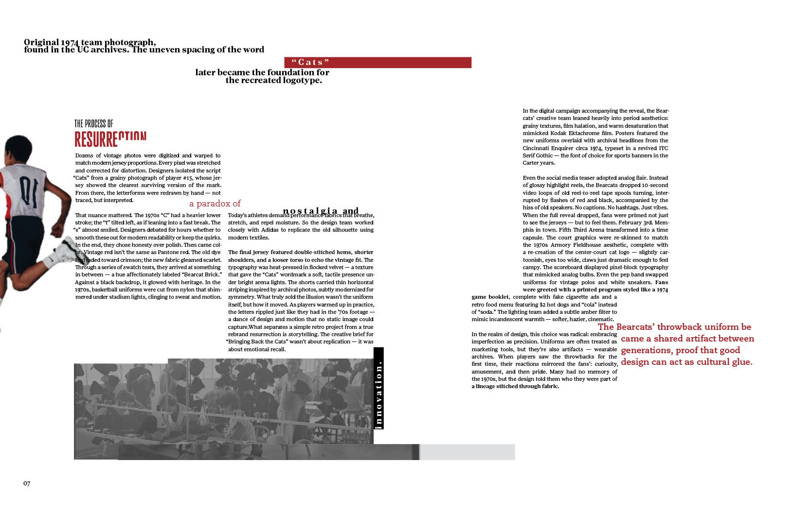 Once curating the innate feeling of connection of time, fashion, history, and sports in the wordmark, I started an outline for the design elements in this publication. Sticking to a bold yet nostalgic red with fragmentation and separation to disconnect the viewer, making them yearn for that connection.